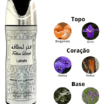 As notas de fundo de Fakhar Black são dominadas por fava tonka, madeira de âmbar, cedro e vetiver, que proporcionam uma base amadeirada e sensual, envolvendo a pele em um abraço quente e aconchegante. Essa combinação cria um efeito viciante e duradouro, deixando um rastro inesquecível por onde você passa.